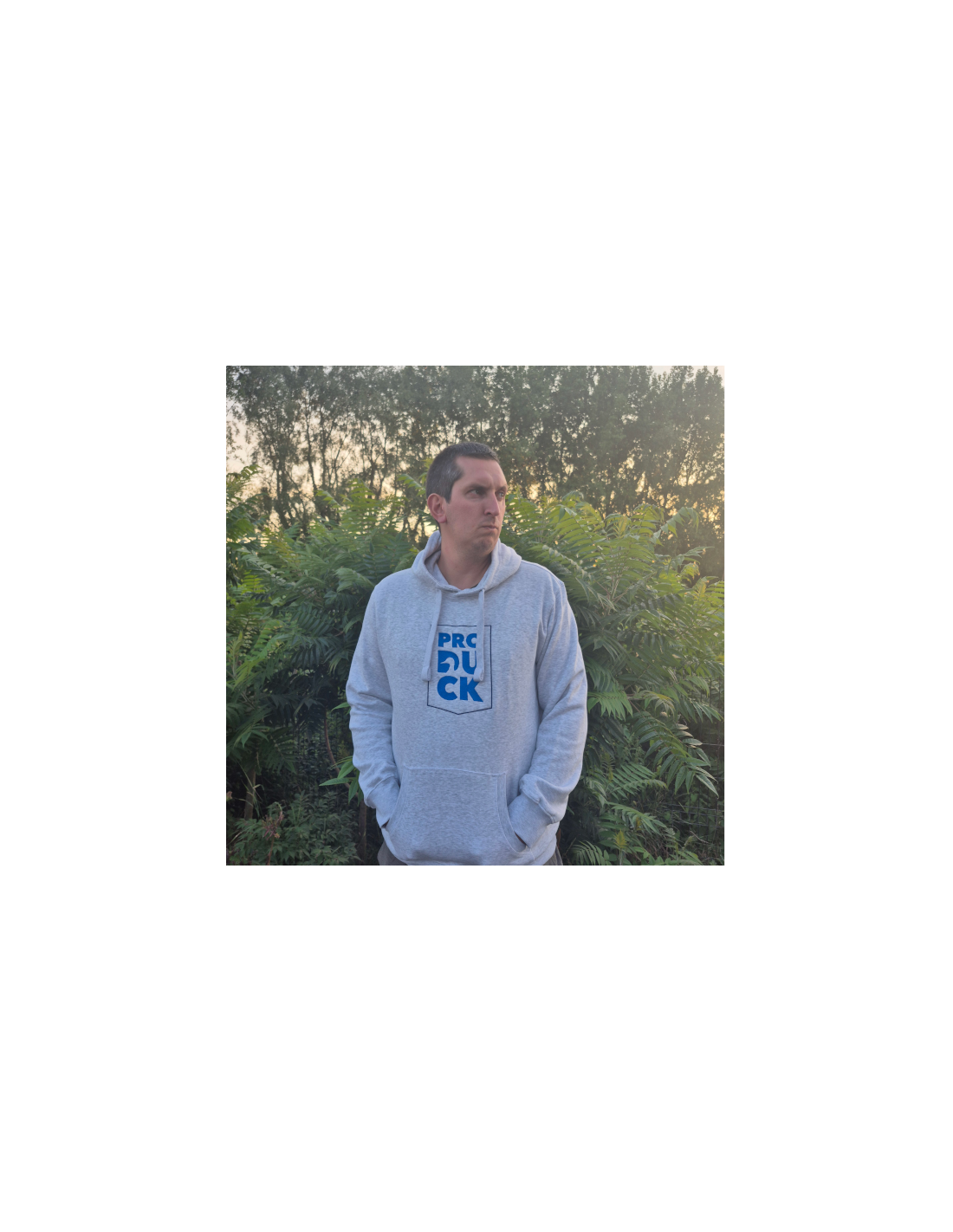 La nouvelle collection de hoodies Pro Duck. Un sweat avec capuche de couleur gris chiné avec un logo ventral brodé Pro Duck bleu ciel. D'une épaisseur de 300gr au m2, ce sweat garantira douceur et confort.