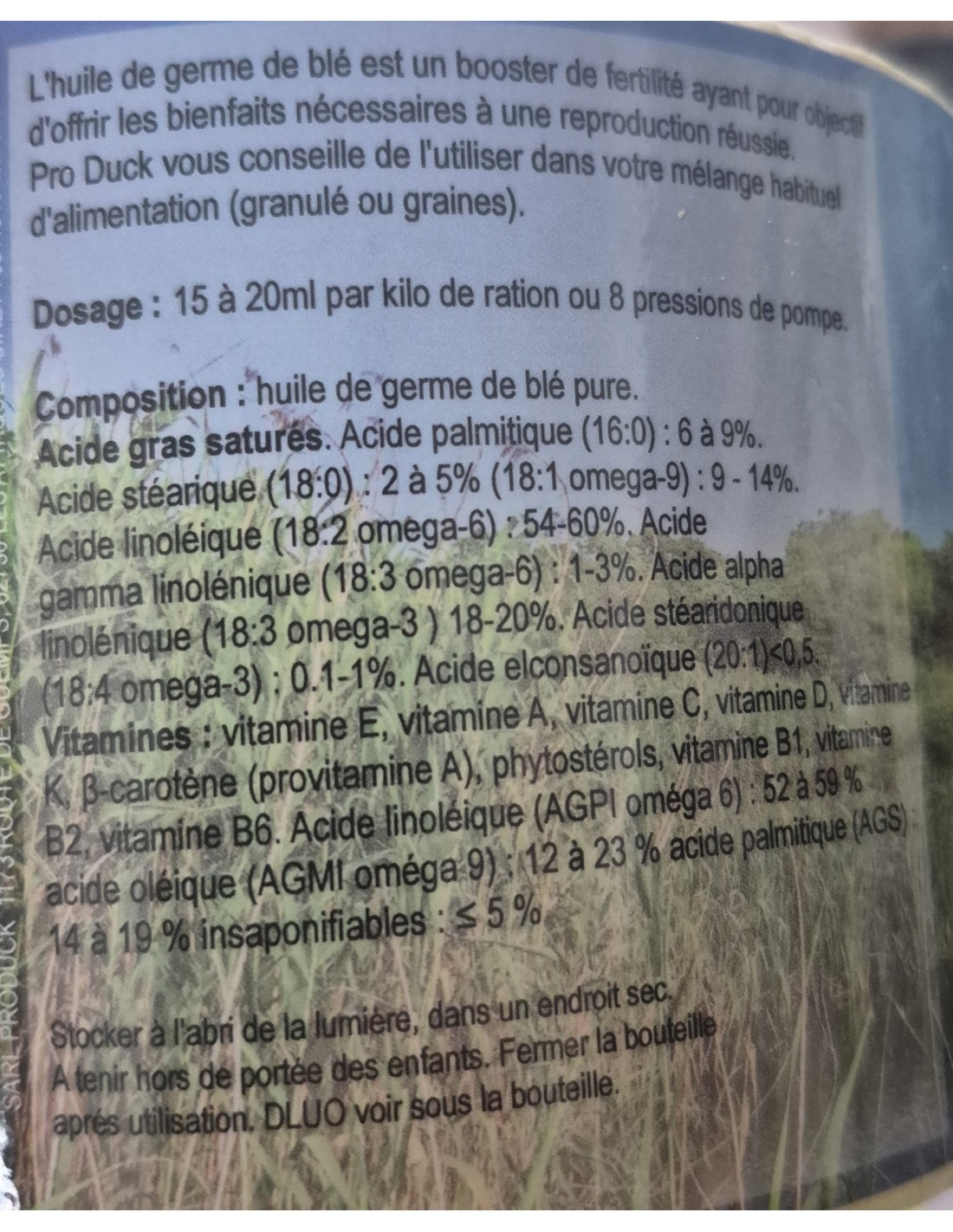 L'huile de germe de blé est un classique de la stimulation de fertilité chez le canard. Sa richesse en vitamines est un fertilisant naturel.