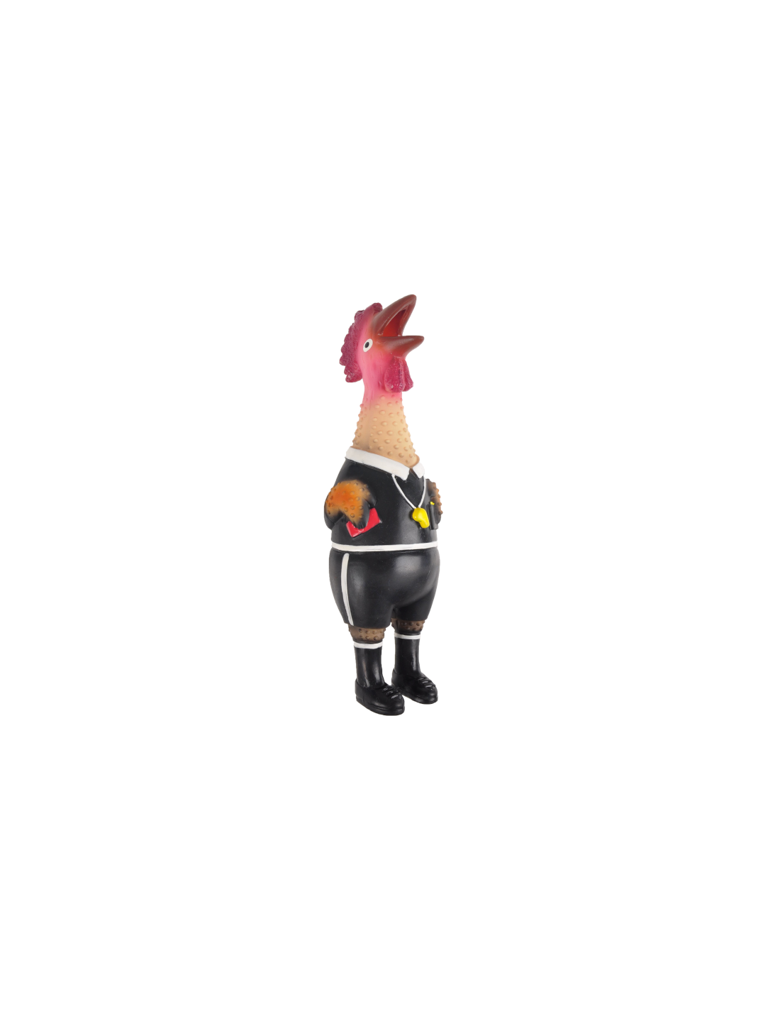 Cette poule en jouet est faite de latex avec un rembourrage en fibre de polyester. Elle a un couineur à l'intérieur pour plus de plaisir de jeu